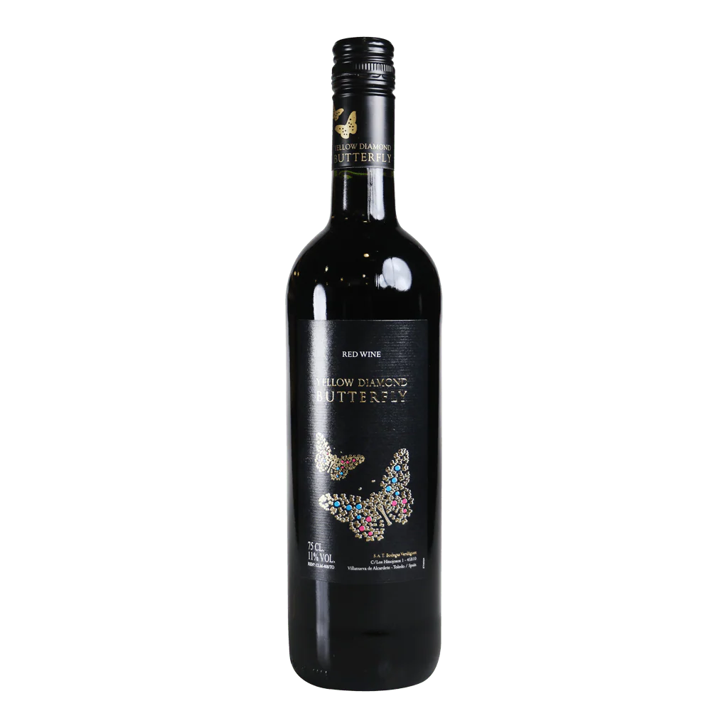 西班牙「彩鑽蝶戀紅酒」( Yellow Diamond Butterfly Red Wine )以其微甜、果香濃郁、口感柔順圓潤的特色聞名,是一款非常容易入門且搭配性高的紅酒。其風味帶有成熟覆盆莓等莓果香氣。