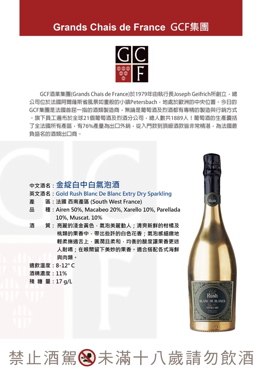 於1979年由執行長Joseph Geifrich所創立,總公司位於法國阿爾薩斯省風景如畫般的小鎮Petersbach,地處於歐洲的中央位置。今日的GCF集團是法國首屈一指的酒類製浩商,無論是葡萄酒及烈酒都有專精的製浩與行銷方式。旗下員工遍布於全球21個葡萄酒及烈酒分公司,總人數共1889人。葡萄酒的生產囊括了全法國所有產區,有76%產量為出口外銷,從入門款到頂級酒款皆非常精湛,為法國最負盛名的酒類出口商。