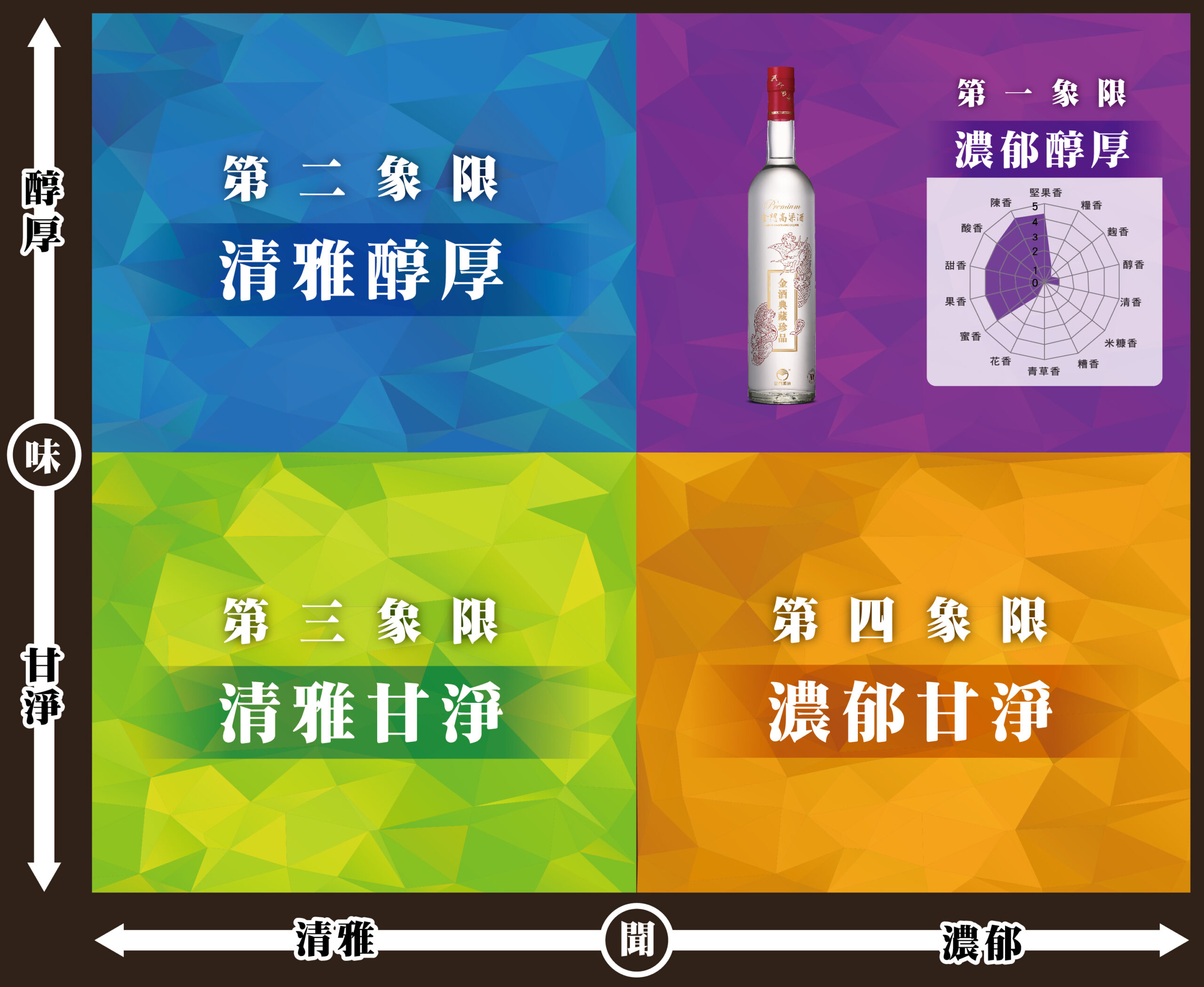 酒液特色:『金酒典藏珍品』嚴選窖藏各式優質陳年酒基,以酒勾酒的獨特勾調技藝,窖藏三年淬煉而成之佳作,孕化出極品佳釀,口感細緻溫醇、陳香優雅柔和,其獨特風格及風味是值得細細品嚐的入門陳年酒款。