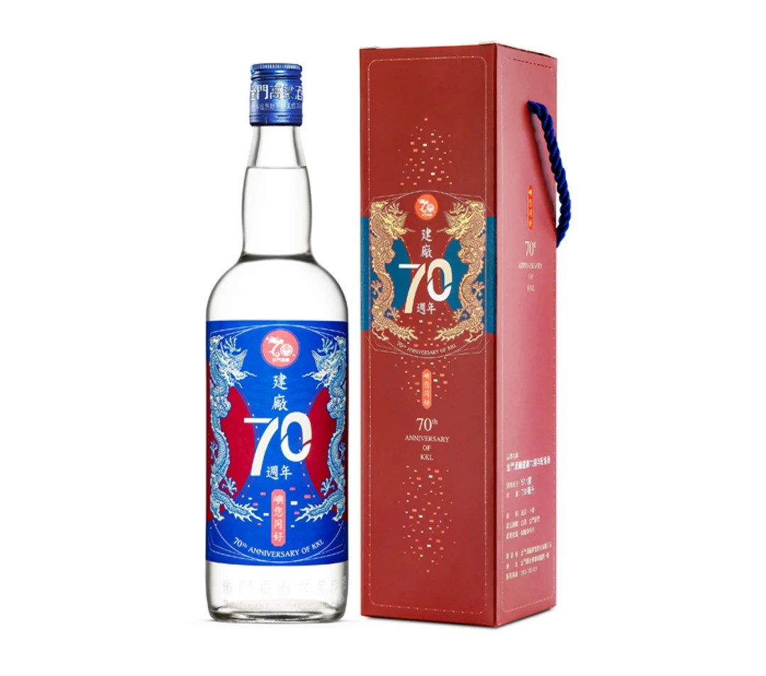 金門門酒廠建廠70週年「嶼您同好」紀念酒,搭配當代風格處理雙金龍調性,選用帶有緞面特質的絲綢寶藍彰顯衣錦還鄉之意,並以大膽的紅藍撞色,表現世代間同好、企業與縣民同好的特質,期盼縣民繼續相挺,讓金酒邁向下一個70年。