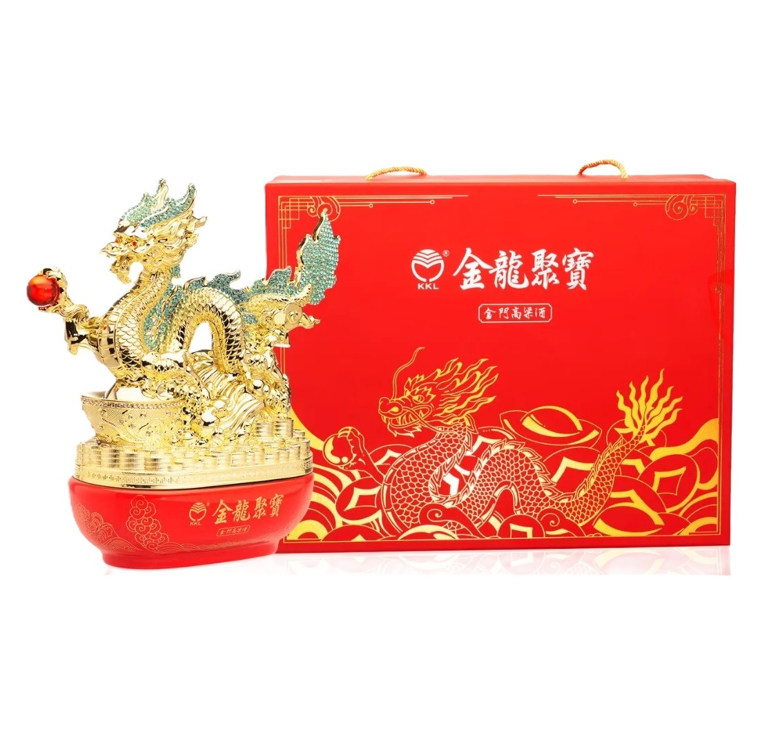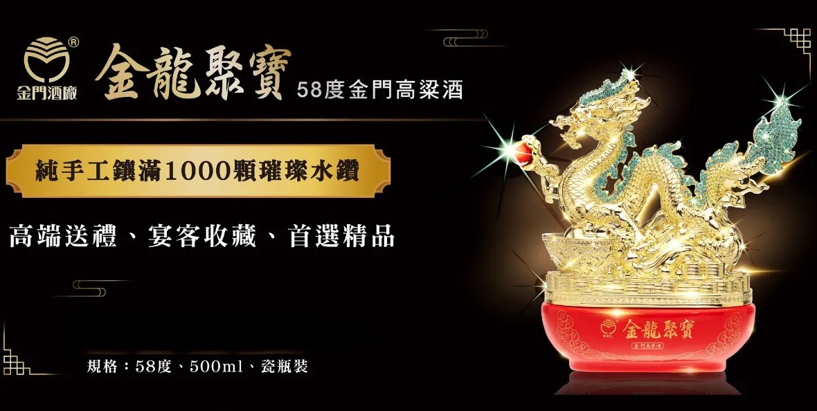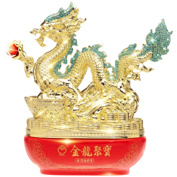 象徵富貴與吉祥的金龍聚寶,是金門酒廠和國際珠寶協會指定設計團隊歷時四年、匠心打造的頂級典藏佳釀。整體瓶身以純手工鑲嵌高達1000顆璀璨琉璃藍寶水鑽,工藝精緻,搭配精美瓷雕包裝,盡顯非凡氣勢。