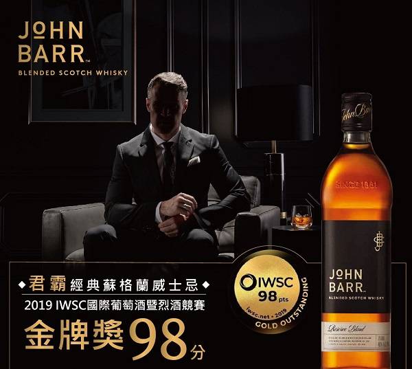 君霸威士忌( John Barr )是一款來自蘇格蘭的調和威士忌,特色是價格親民、風味均衡,帶有果香、蜂蜜、橡木、焦糖和淡淡的雪莉桶甜香。由世界級威士忌大師理察派特森( Richard Paterson )精心調和,並曾獲得國際烈酒競賽( IWSC )金牌,被認為是適合入門者與日常飲用的經典威士忌。